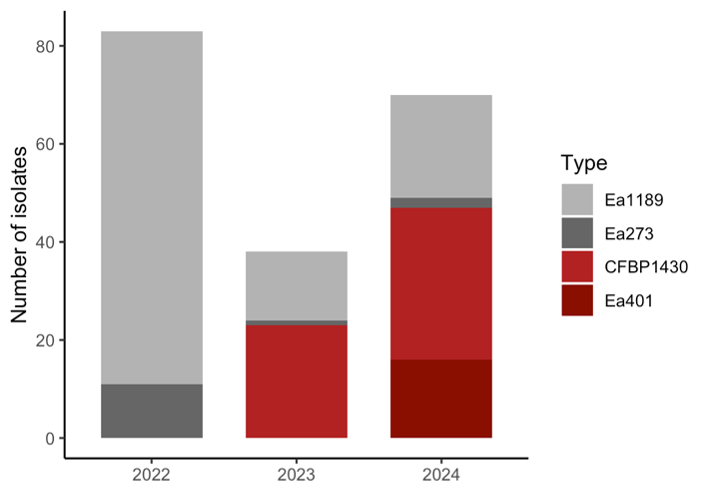 The 2022 result showed that the Ea1189 type was most common across most locations, with only a small percentage of the Ea273 type. During the 2023 and 2024 seasons, the Ea401 and CFBP1430 types were detected and the later become dominant in 2024.