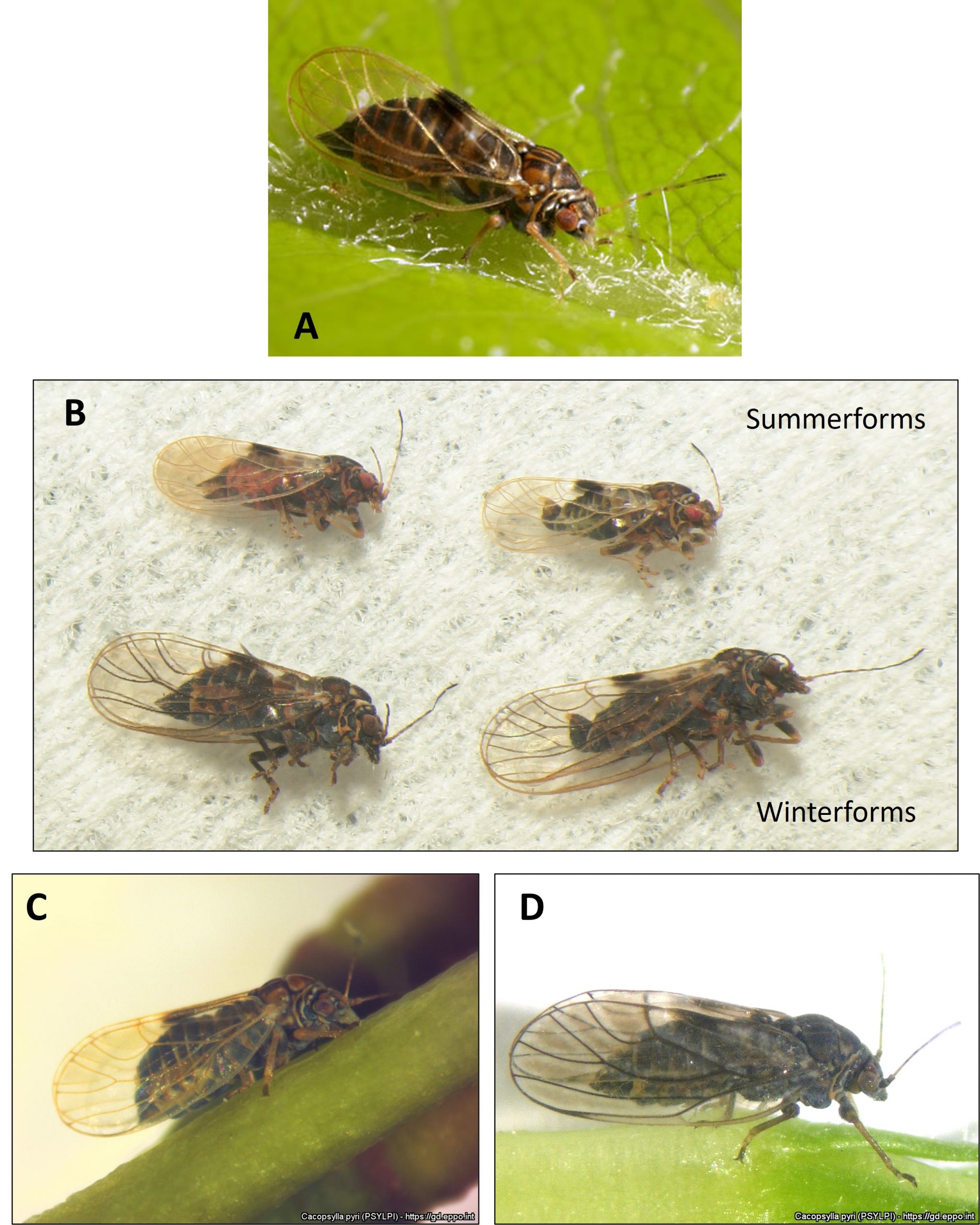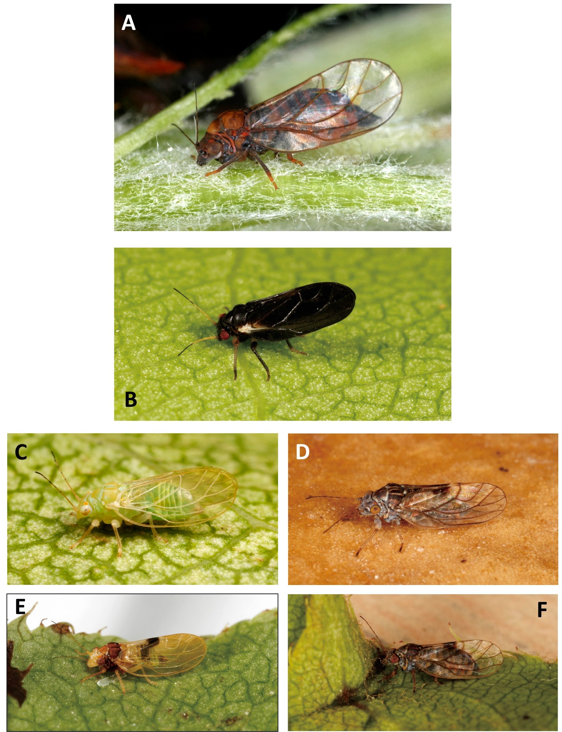 Fig. 2A (Cacopsylla pyricola): Brian Valentine https://www.britishbugs.org.uk/homoptera/Psylloidea/Psylla_pyricola.html. Fig. 2B (summer and winter forms of C. pyricola): Rodney Cooper, USDA-ARS, Wapato, WA. Fig. 2CD (Cacopsylla pyri): Monika Riedle-Bauer, Federal College and Research Institute for Viticulture and Pomology, Klosterneuburg, Austria; https://gd.eppo.int/taxon/PSYLPI/photos (open access). Figure 3A (Cacopsylla pyrisuga): Vladimir Motyčka; https://www.biolib.cz/en/image/id183554/ (used with permission). Figure 3B-F (Asian psyllids): Geonho Cho, Seoul University; https://mapress.com/zt/article/view/zootaxa.5177.1.1 (used with permission)