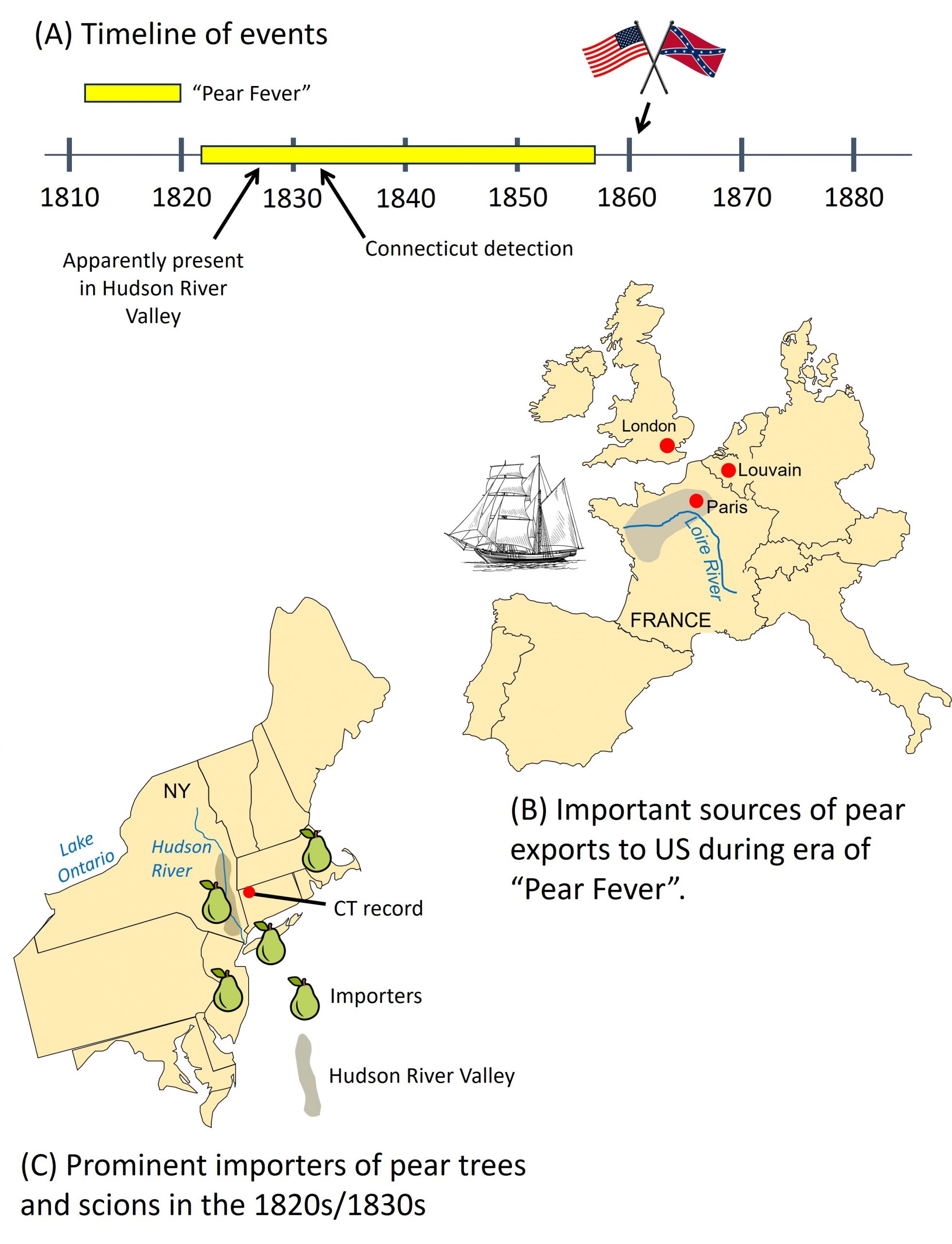 Understanding where and when hitchhiking C. pyricola entered the US requires understanding the movements of pear trees and scions. Importing of pear cultivars into the US began in earnest in the 1820s at the onset of a 4-decade period known as “pear fever” having origins in Europe where it was likened to the tulip craze of the 1600s (Fig. 4A: yellow bar). New cultivars surged in the orchards of European pear breeders. Belgium, France, and England were the major sources of cultivars entering the eastern US when psylla arrived in the 1820s (Fig. 4B). Belgium may be the country most responsible for producing the modern pear – Belgium in fact was referred to as “the Eden of the pear tree” by one early-American pear grower. Many cultivars from Louvain, Belgium (Fig. 4B) in the early-1800s were sent to England and France for propagation and dissemination. Many also were exported to America. In France, Paris and its Royal Gardens were centers of pear culture in the seventeenth-century as the French aristocracy developed a passion for the fruit. Nurseries of the Loire River Valley and nearby regions (Fig. 4B) produced many cultivars that found their way into the US in the early 1800s. Lastly, while England was not a major producer of new cultivars, it was an important exporter of trees and scions to America. Cultivars from Belgium and France arrived regularly in the gardens of the Horticultural Society of London (Fig. 4B), followed often by dissemination to the US. The society catalog of 1826 listed more than 500 cultivars of pears in its London gardens, most of Belgian or French origin.