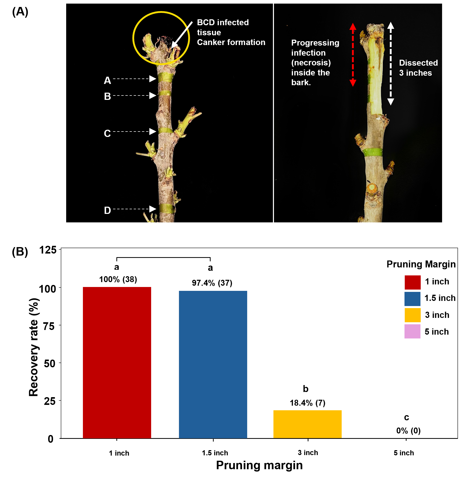One of the most common questions growers ask is how far to cut below a visible canker to completely remove the canker and associated pathogens. A recent study found that bacteria can still be recovered 3 inches below visible canker but not 5 inches (Fig. 1), therefore, removing approximately five inches below the visible margin of a canker during hot/dry conditions can effectively remove the pathogen from further infection and limit disease spread during pruning. In addition, allowing pruning wounds to dry and heal before the onset of cool, humid, or wet conditions is an effective cultural strategy for reducing infection risk. It is also beneficial if pruning tools are sanitized after every cut as pruning tools could transfer bacterial inoculum from infected to healthy tissues, leading to new infection.