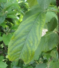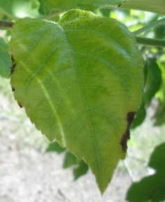 We have seen a wide range of phytotoxic reactions on the leaves of trees treated with metamitron in WTFRC trials. In most cases, there has been no visible damage to leaves at all, but occasionally, we have observed some chlorosis/mottling in between the veins of primary leaves, as well as some marginal leaf burn similar to what we have seen from ATS or lime sulfur (Figure 1). The most severe cases of phytotoxicity have been associated with the use of experimental adjuvants like oils and silicone-based surfactants (not allowed per the product label), applied with metamitron when temperatures were in the 90s. Even in those cases, the trees quickly grew out of that condition, making it difficult to find any evidence of phytotoxicity 2-3 weeks after application. Growers should follow the Brevis™ SC label directions, which require the use of a NIS and applying when temperatures are forecasted to be below 84°F for 1-5 days after application. The label prohibits the use of crop oil concentrate (COC), summer horticultural oil, or tank-mixing with any oil-based formulation. When applied according to these directions, there should be very little risk of significant phytotoxicity. Most importantly, we have never observed any damage to treated fruit, which has been consistently clean in WTFRC trials.