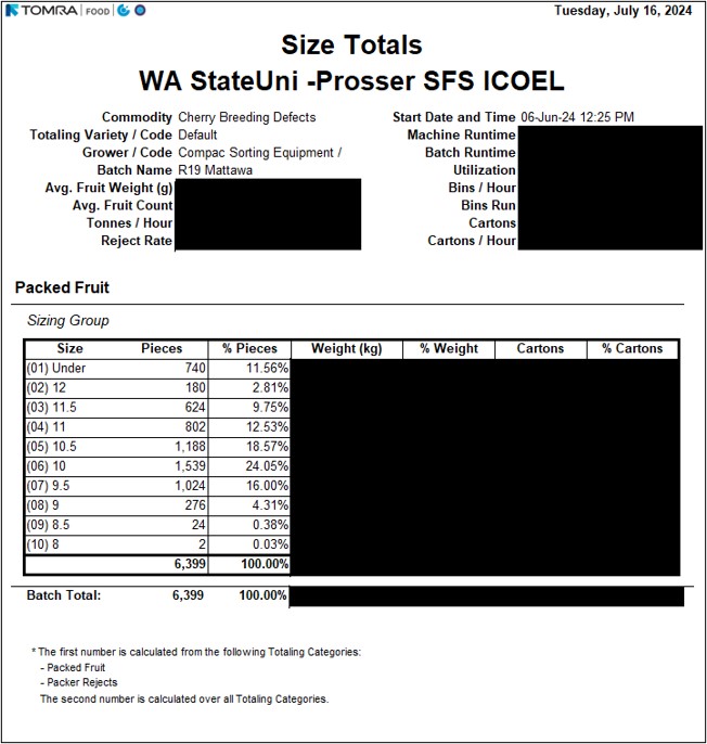 The optical sorter also generates many different reports at the end of each run, which are comparable to those produced by commercial fruit packing companies. One of the reports produced is the size distribution for each set of fruit, where it shows the total amount and percentage of fruit for each row size detected (Figure 5).