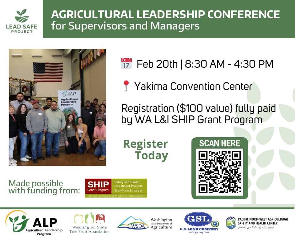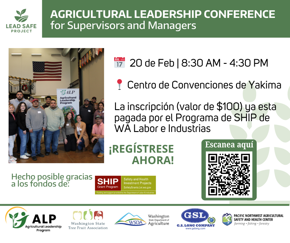 The Washington State Tree Fruit Association (WSTFA), WSDA’s Technical Services Education Program (TSEP), the Agricultural Leadership Program (ALP), and the Pacific Northwest Agricultural Safety and Health (PNASH) Center are partnering to offer the Agricultural Leadership Conference in English and Spanish, on February 20th, 2026, in Yakima WA.